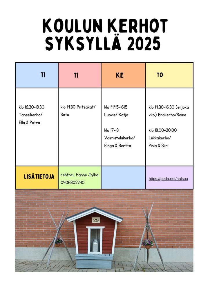 Halsuan yhtenäiskoulun Pedanet sivustolta löydät ajankohtaiset tiedot ja lomakkeet https://peda.net/halsua Kalenterista näet lisäksi koulun tilojen varaukset.